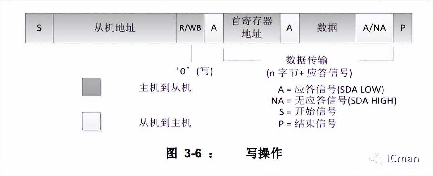 读操作的首寄存器地址由不含数据的写操作指定,由STOP信号结束。然后主机送出开始信号,和器件地址和读取位(R/WB=1),接下来的数据地址,是由首地址开始,然后地址依次加一。