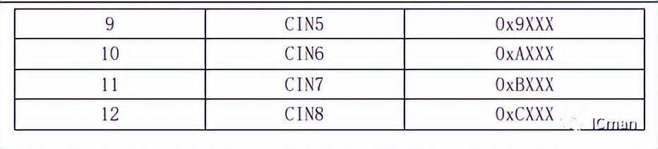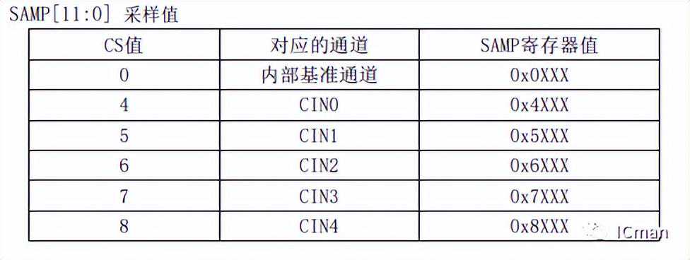 CS[3:0]采样值对应的通道,采样时候对应是采样13个通道,而我们SC09B通道CIN0到CIN8对应是内部通道4到12。即当读取到CS值为4的时候,对应的SAMP值即为对应CIN0的采样值。