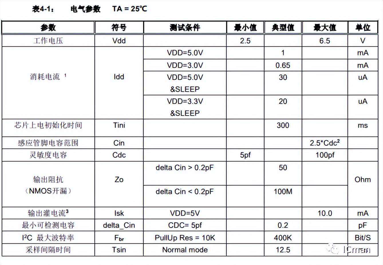如果在一段时间内(75秒左右)没有检测到按键并且SDA端口一直保持高电平,芯片会自动进入省电模式。只要让SDA保持高电平时间不超过75秒,芯片就不会进入睡眠模式。在睡眠模式中,按键的采样间隔会变长,电流消耗(Idd)会减小。如果检测到按键,芯片会马上离开睡眠模式,进入正常模式。