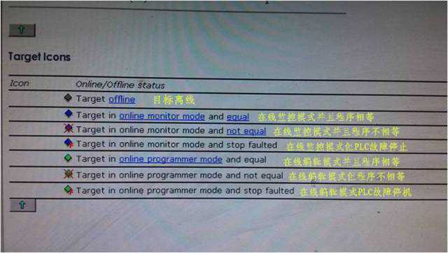 在线后观察目标PLC的状态图标,会出现以下几种状态,对应的解释如图: