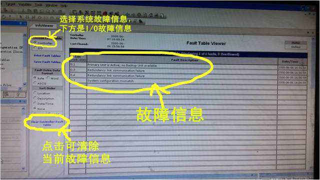 进入诊断画面如下,故障信息在中间,左侧可以选择查看系统/IO故障,左下方有清除故障选项。