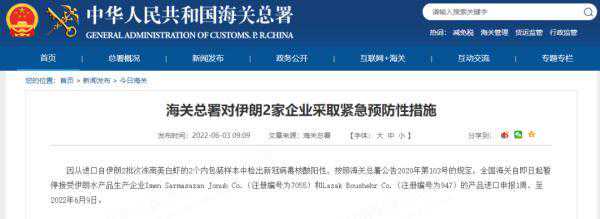 因从进口自伊朗2批次冻南美白虾的2个内包装样本中检出新冠病毒核酸阳性,按照海关总署公告2020年第103号的规定,全国海关自即日起暂停接受伊朗水产品生产企业ImenSarmasazanJonubCo.(注册编号为7055)和LazakBoushehrCo.(注册编号为947)的产品进口申报1周,至2022年6月9日。
