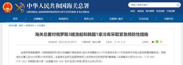 由俄罗斯渔船捕捞、经韩国储存的2批次冻细鳞大麻哈鱼和1批次冻狭鳕鱼计3个外包装样本和1个内包装样本中检出新冠病毒核酸阳性,按照海关总署公告2020年第103号的规定,全国海关自即日起暂停接受上述货物涉及的俄罗斯3艘渔船(注册编号分别为CH-650、СН-95P、СН-151)和韩国1家冷库(注册编为KP-074)的产品进口申报1周至2022年6月9日。