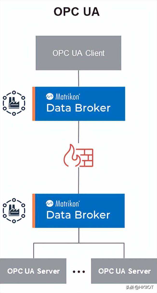 此外,OPCUA是一个客户端/服务器(C/S)通信架构,需要客户端发起连接请求,通过防火墙的入站端口找到服务器,从而建立连接。然而从IT角度讲,这是不安全的。因为OPCUA客户端在北向,OPCUA服务器在南向,从北向到南向建立连接需要防火墙设置入站端口,存在潜在的安全风险,而且防火墙本身就是为了进行数据隔离。为了降低工厂OPCUA服务器的管理成本以及保证OPCUA服务器的安全连接,虹科为信息化工厂建设提供一个服务器聚合管理和安全连接的解决方案——DataBroker软件,该软件的系统框架图如下图所示。