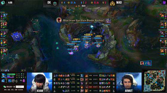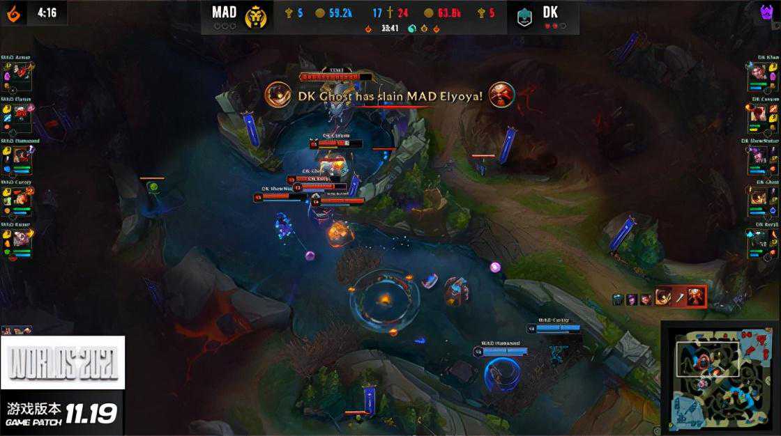 DK野辅不甘示弱也来抓上,扛塔硬杀了杰斯,随后双方野辅都赖在上路不走了,虽然DK反蹲到了MAD的攻势,但发条在中路的灵性大招打断了阿兹尔的传送,MAD上野辅越塔打出0换3大获全胜,皇子砍下三杀梦幻起飞~11分钟杰斯利用峡谷先锋直接通关单吃了上路两座塔,盲僧只得控下风龙勉强止损。看到DK下路点一塔时杰斯传送下路绕后包夹,MAD全员集结打出1换3守住了一塔,Humanoid的发条换线到上路还单杀了Khan的凯南。大龙出生前DK下路被通关,只在中路付出上中野的代价击杀了MAD下路组,可是经济仍然落后6千。