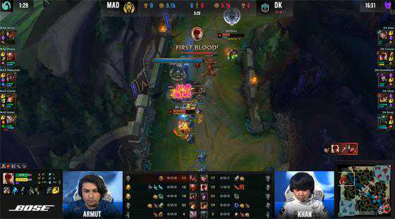 纳尔尝试单掉上路一塔时遭到DK上辅包夹,Khan的格温一套行云流水的技能单杀了纳尔,solo掉火龙的盲僧和队友入侵MAD的上半野区,包夹MAD支援纳尔的众人,落单的厄斐琉斯直接被DK埋伏在草丛的中野秒杀,DK直接rush掉刚刚出生的大龙,滚起了5千的经济雪球。MAD三C发育惨淡,完全组织不了有效的反抗,DK势如破竹连破中、下两路水晶,损兵折将的MAD勉强在上路高地塔处终结了格温,暂时守住了唯一的水晶。28分钟DK携带两路超级兵线直捣黄龙,打出0换3一波结束比赛,1-0轻松先下一城!