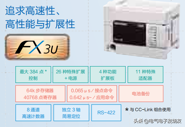 FX3U系列的PLC作为第三代小型可编程控制器。具有速度、容量、性能、功能的新型、高性能机器。业内最高水平的高速处理,内置定位功能得到大幅提升。下面我们就聊聊FX3U都有哪些配置及其扩展。