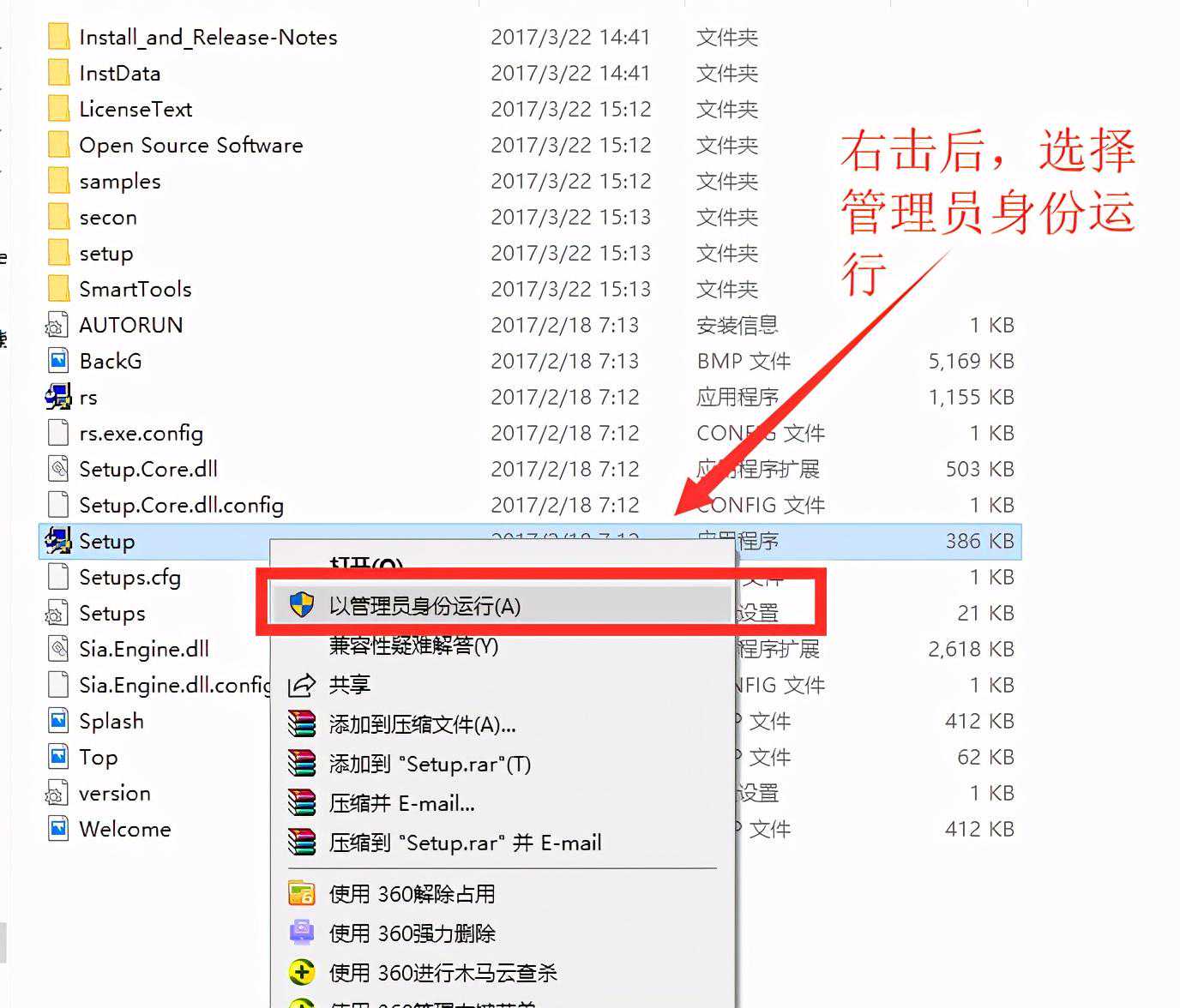 5、在Windows10下安装软件,为了防止权限不够安装出错,需要在安装程序上选择以管理员身份运行此程序。