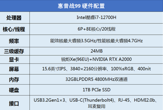 本次送测的惠普战99的硬件属于中高端水平。主要硬件采用了酷睿i7-12700H处理器和NVIDIARTXA2000组合。目前惠普战99还提供其它两款i9处理器供选择,不过对于大部分用户性价比最高显然还是i712700H。显卡方面,除了RTXA2000外,惠普战99还有两款专业级显卡可选,分别是T600、RTXA1000。