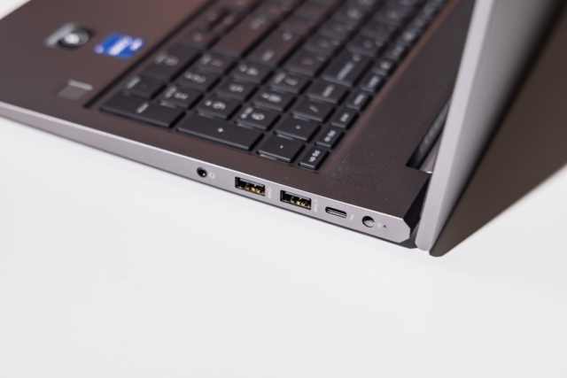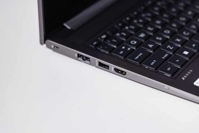 除了机身和键盘上的优秀设计外,惠普战99的接口也是一如既往地齐全,左侧为锁孔,RJ-45网口,、HDMI接口以及一个SC卡槽,右侧则为电源接口、USBType-C(支持雷电4)接口和两个接口以及一个音频复用插孔,覆盖了绝大部分人的办公需求。用户不仅摆脱了日常携带扩展坞的麻烦,还能使用这些接口同时外接两个4K显示器,非常方便。
