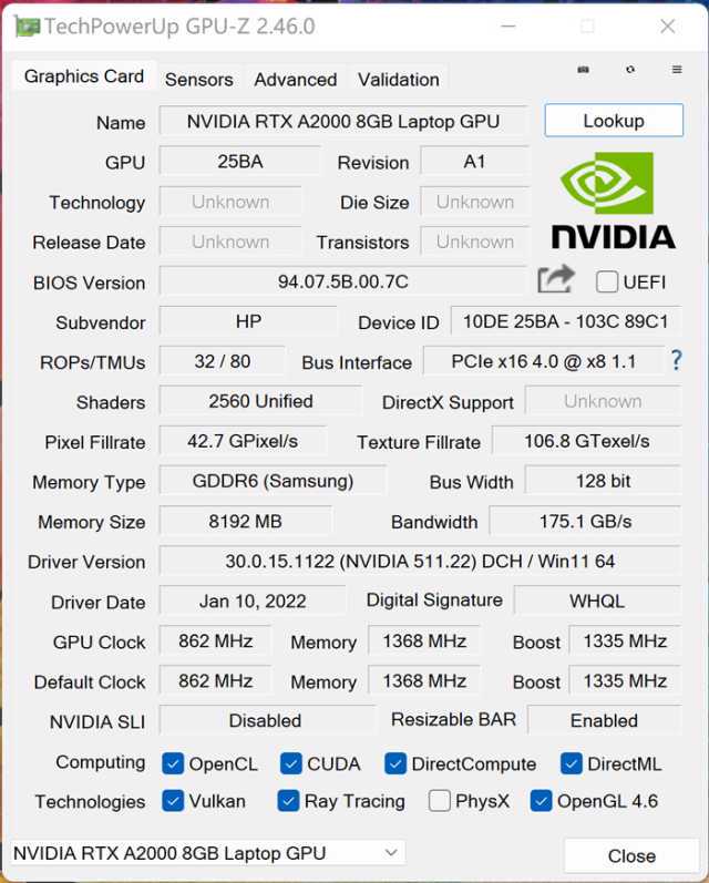 上面我们提到本次送测的惠普战99搭载了NVIDIARTXA2000Laptop专业显卡。这款显卡采用“安培”架构和8nm制程工艺,内置第二代光追专用核心RTCore、第三代AI加速处理器TensorCore,拥有2560组CUDA加速核心,其在光线追踪与效能方面有大幅提升,适合对图形性能有更高要求的进阶用户使用。