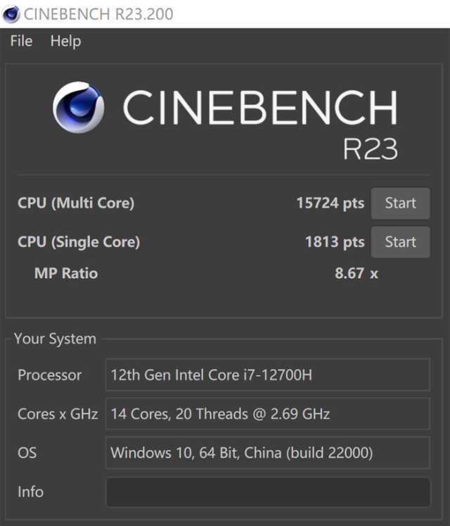 CinebenchR23测试中,酷睿i7-12700H处理器多线程分数为15724pts,单线程分数为1813pts。由此可见,凭借着性能核的IPC提升以及额外的能效核加持,惠普战99的性能提升非常明显。