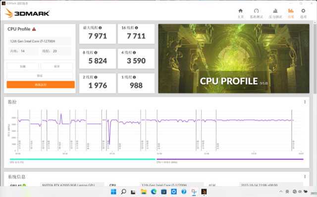3DMark也推出了独立的CPUProfile项目,用于测试处理器不同线程下的性能,以更好的对应不同类型的游戏负载。在此项测试中,惠普战99的最大线程得分7971,展现出了卓越的性能。