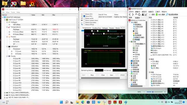之后,我们进行了StressFPU单烤,结果显示,惠普战99的CPU温度79~93℃,功耗在65W~75W之间,P核2.7~3.5GHz,E核2.5~2.9GHz。