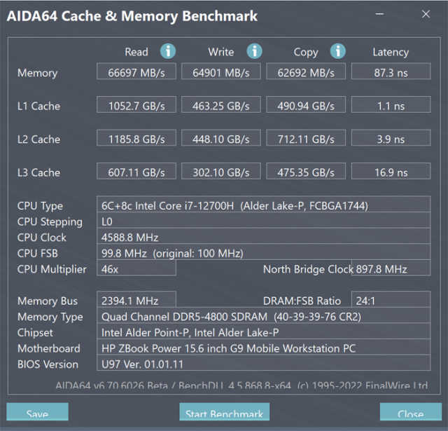 关于内存,通过AIDA64中的CacheMemoryBenchmark测试工具可以看到,惠普战99的内存的读写速度分别为66697MB/s和64901MB/s,复制速度为62692MB/s,延迟为87.3ns,表现十分出色。