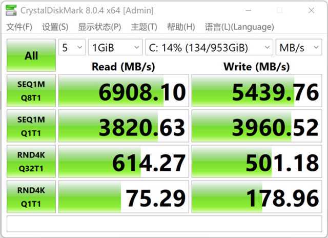 硬盘方面,在CrystalDiskMark实际测试中,这块硬盘的读取速度达到了6908.1MB/s,写入速度为5439.76MB/s,即便在固态硬盘中也属于第一梯队,十分出色。