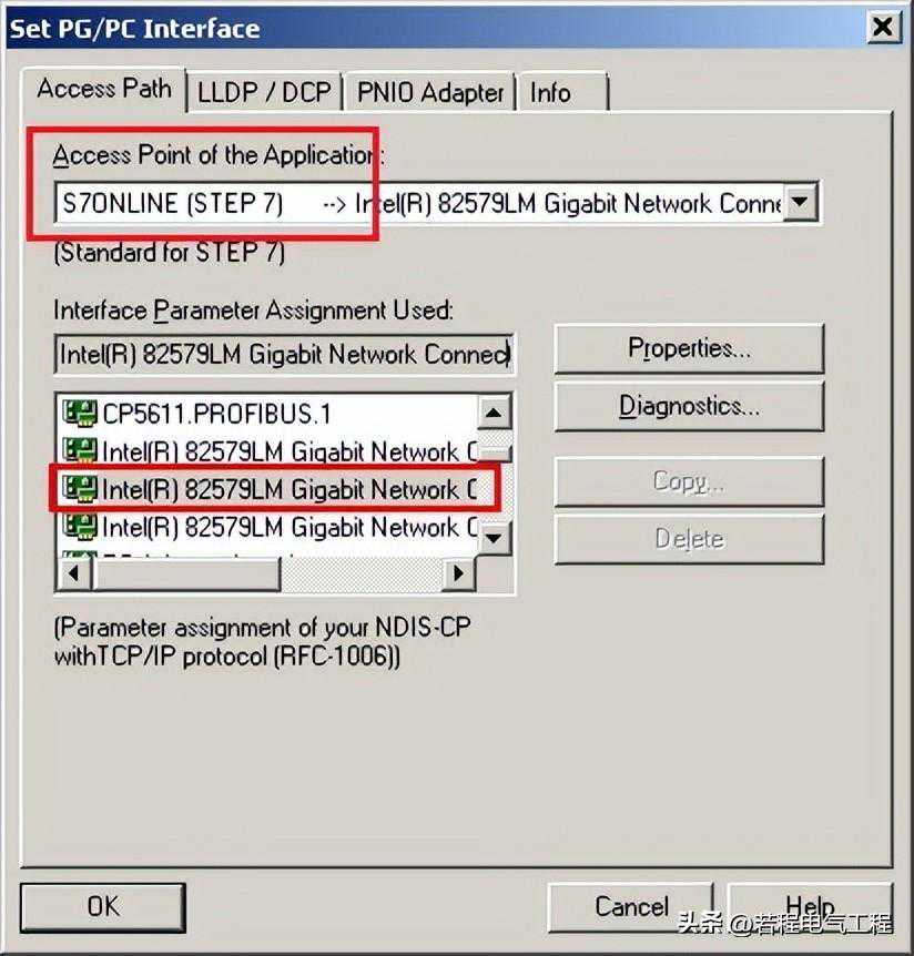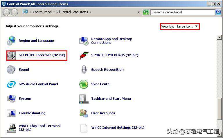 2.同时需要在计算机的控制面板中设置PG/PC接口。打开计算机的控制面板,将右上角的查看方式改为大图标,然后找到设置PG/PC接口。在弹出的窗口中上方的应用程序访问点的下拉菜单中选择“S7ONLINE(STEP7)”,并在下方的接口参数分配(左下方滚动条)中选择“计算机本地连接网卡名字.TCP/”的选项,注意不要选择“计算机本地连接网卡名字.TCP/”的选项。