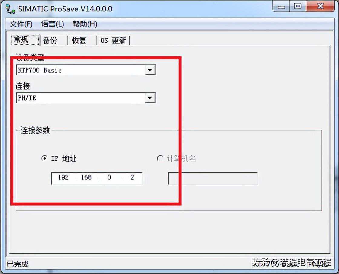 1.选择操作系统“开始”菜单所有程序SiemensAutomationSimaticProSave,打开ProSave软件。在“常规”选项中,选择设备类型,连接方式。所有能下载的方式都能做备份恢复,电缆以及下载参数设置和下载是一样的。