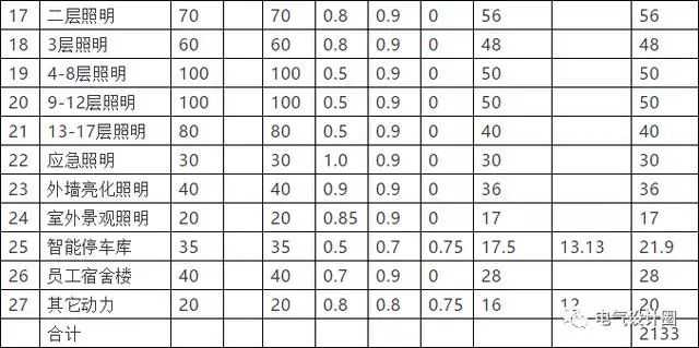 (注明:配变载容率为80﹪计算,系数取1.25,同时系数K∑取0.8。消防泵、风机负荷不计在内。1—17层含大厅、门厅、客房照明负荷,因风机盘管的负荷不大时,可以合并在照明负荷中计算)。