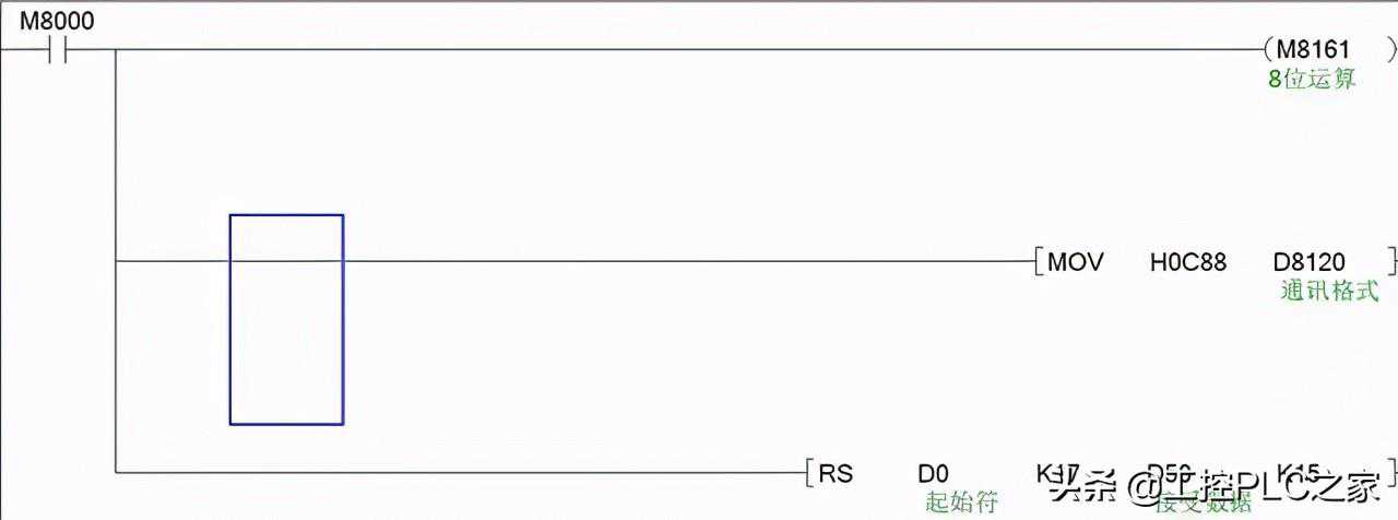 M8161=1,为8位运算,意思就是忽略高8位只传送数据的低8位,为什么这么做后面会说到。MOVHOC88D8210是指定通讯格式,它是怎么算出来的,我们看下D8120内容: