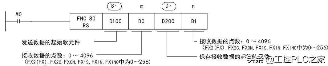 RS指令用于指定从FX可编程控制器发出的发送数据的起始软元件和数据点数,以及保存接收数据的起始软元