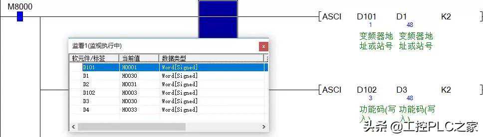 地址Address:就是站号,两个ASCII码组成,例如站号1,地址就是01H,转成ASCII码就是30,31,PLC监控: