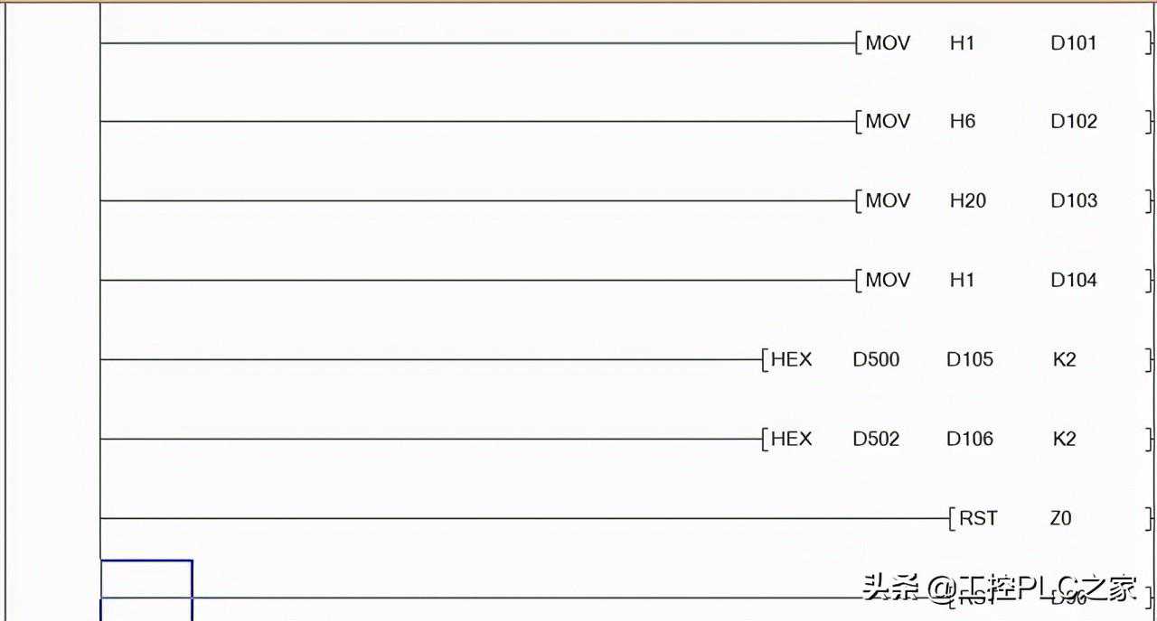 根据变频器的MODBUS功能,我们知道写入频率的地址是2001H,因此高位20H传到D103,低位01H传到D104,然后将频率值传送到D105D106,传送完毕LRC值复位。