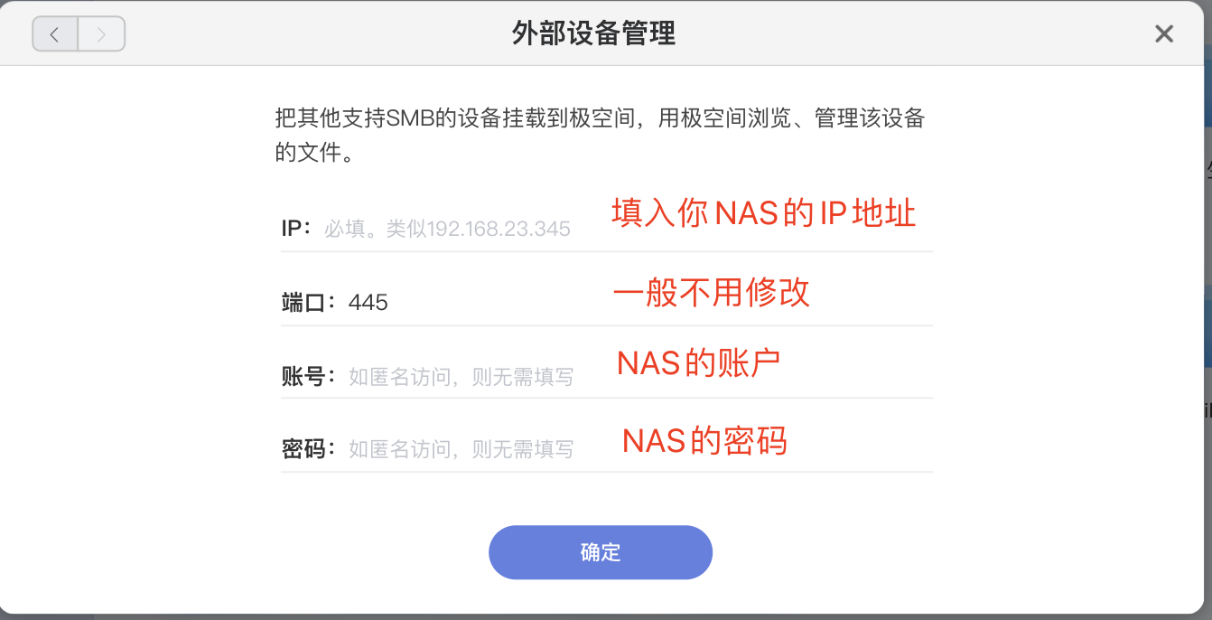 选择SMB协议后,就可以输入自己NAS的账号等相关信息了,需要录入的信息我在下图的红字标注了。