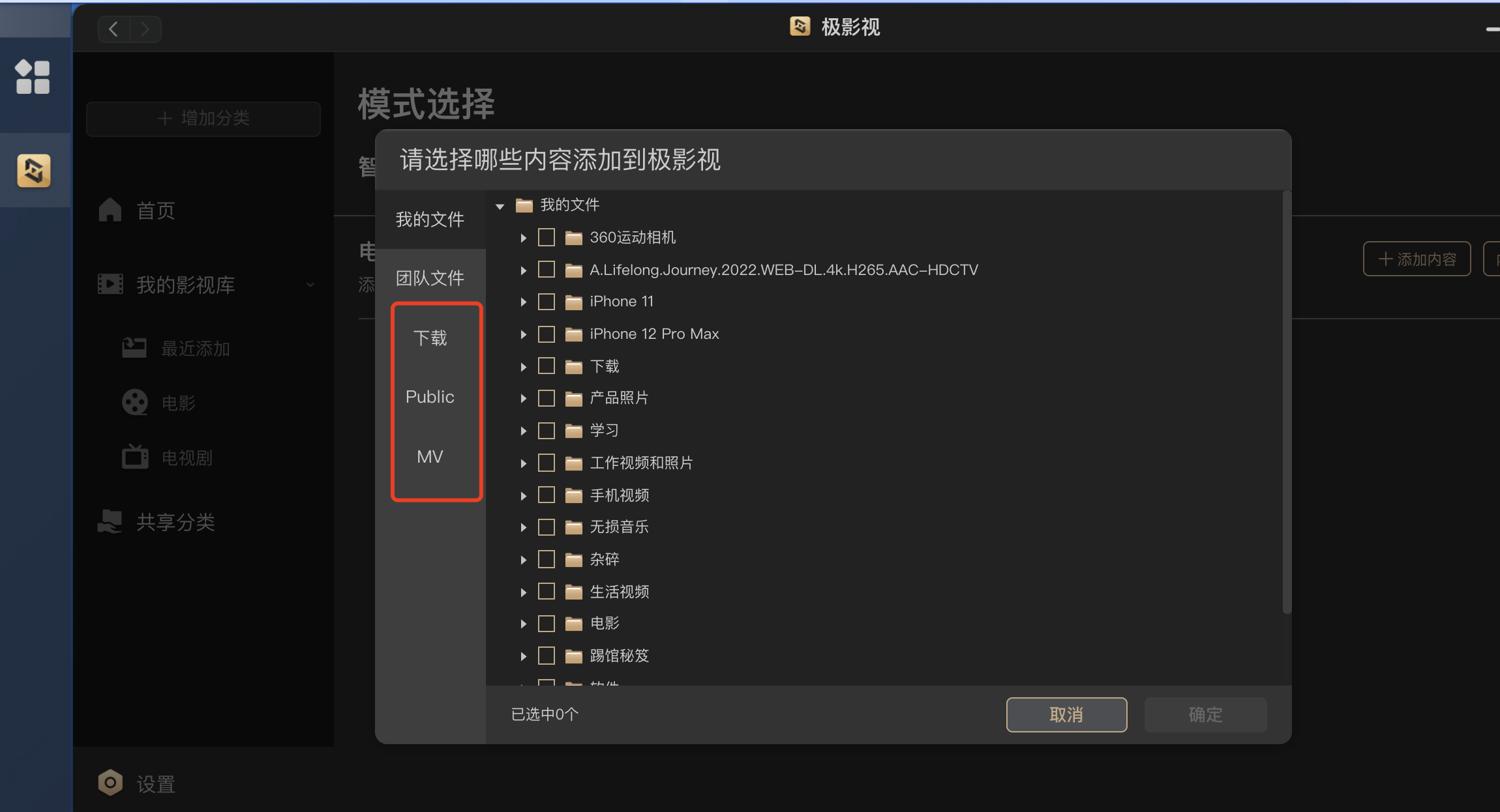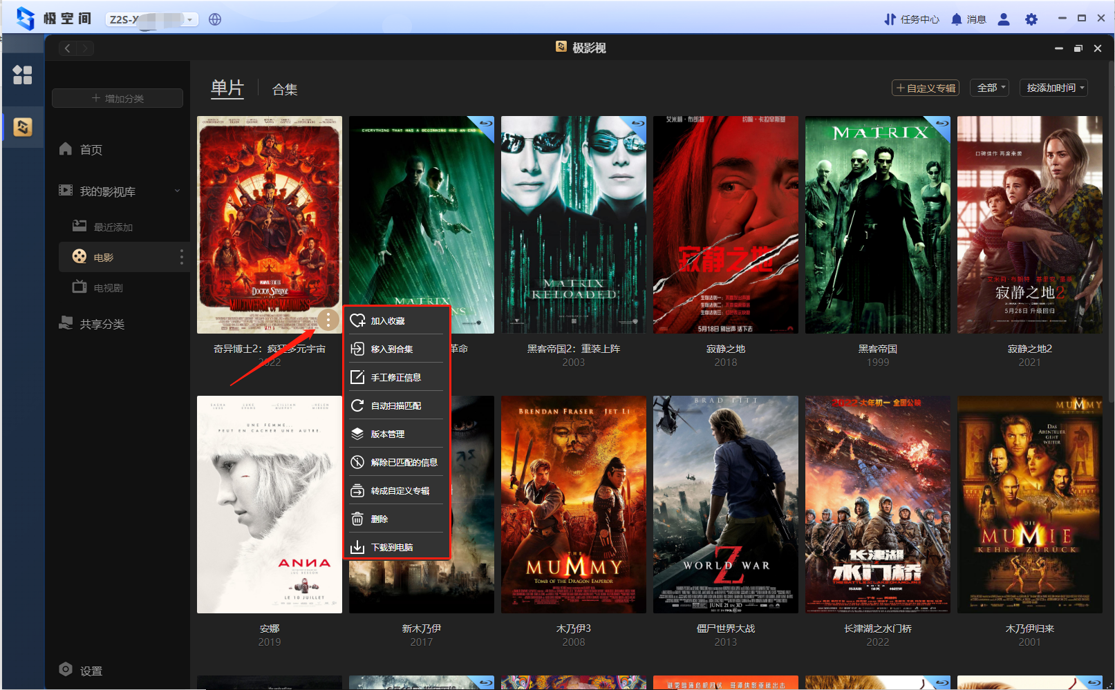 在极影视那边就可以按之前的步骤来添加电影了,添加完成后也是可以自动识别出来海报墙的,我框出来的这三个文件夹都是我威联通里的内容。