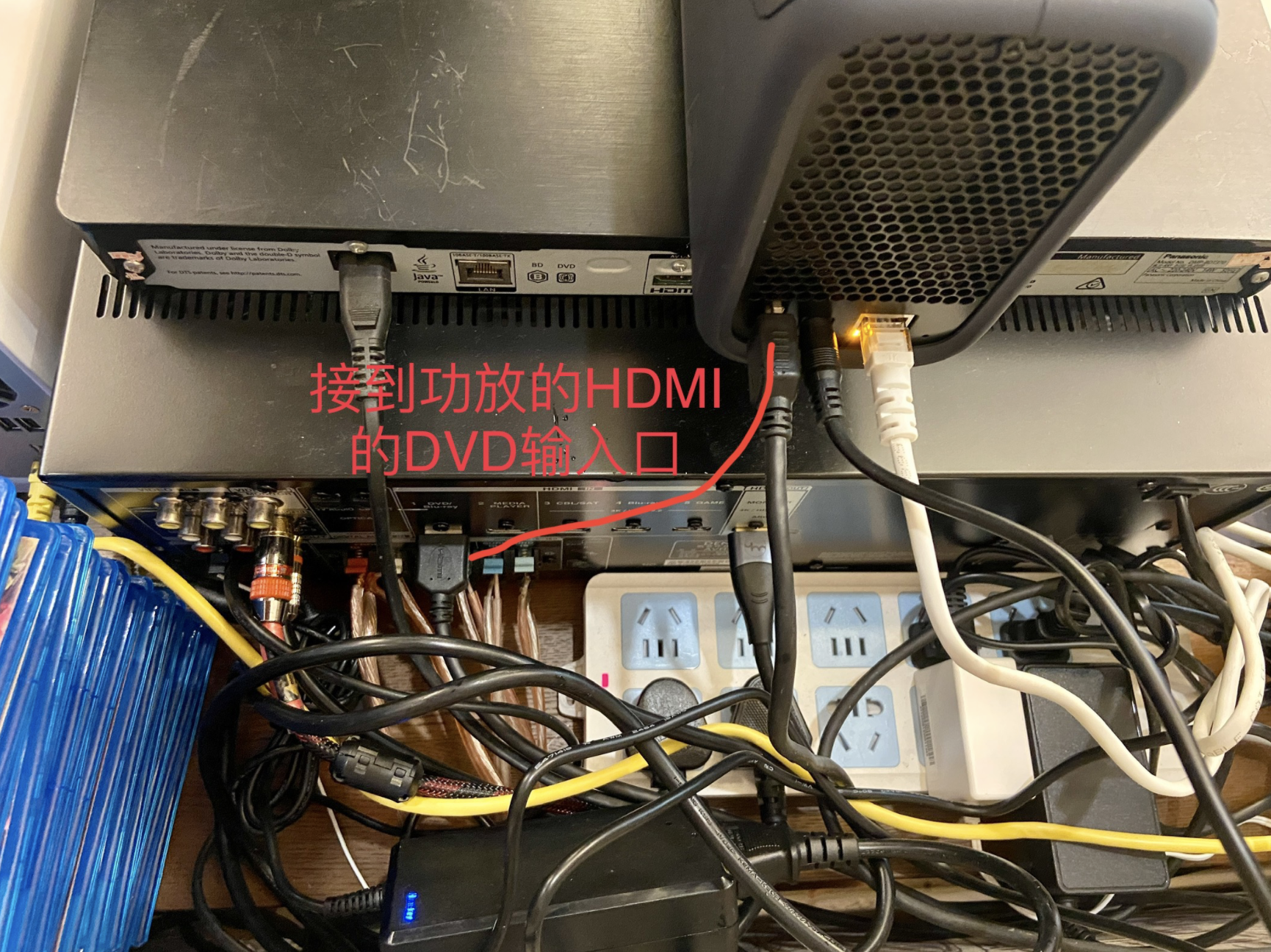 我是将HDMI接入到我家里的功放输入接口,然后通过功放在输出到电视。