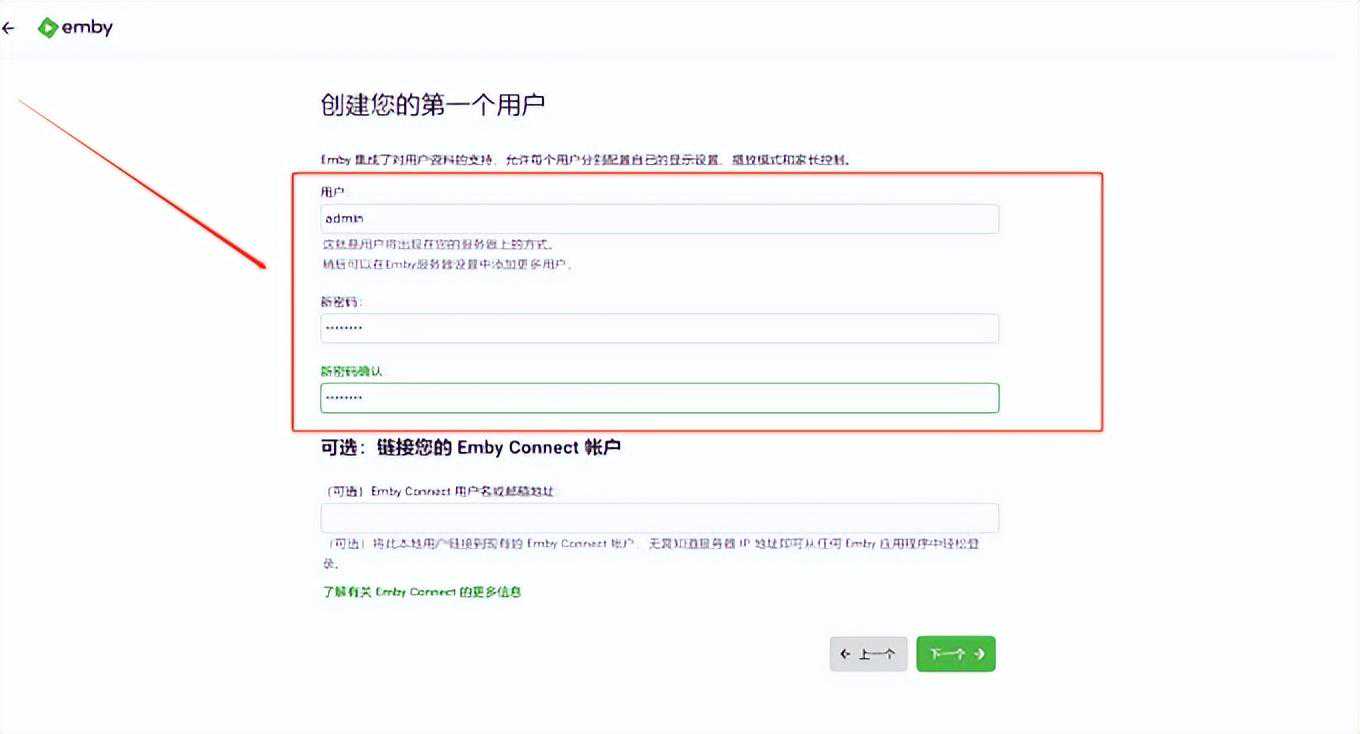 进入创建用户步骤,填写用户名,密码。加新媒体库,直接选择NAS上放电影的文件夹即可。