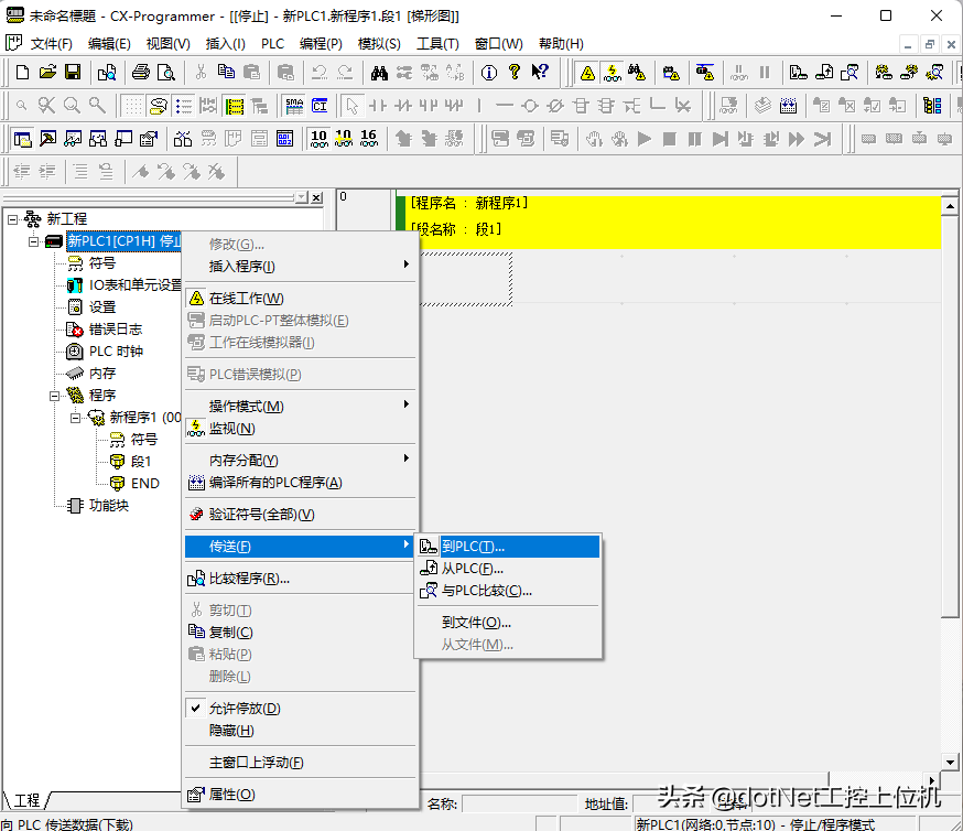 6、下载PLC程序,选择CPU,右击,选择传送到PLC,进行PLC程序下载。