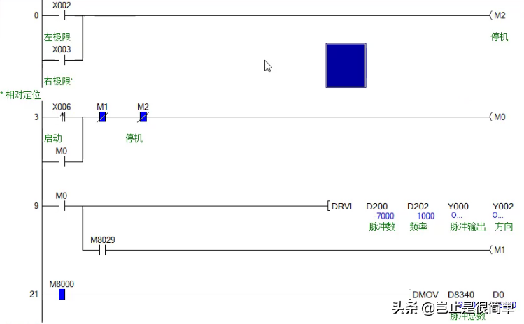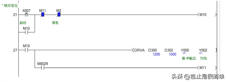 DRVAD300D302Y0Y2—按下X7启动后,Y0后发出以D302为频率,D300位脉冲数(D300为正值正脉冲,正转,在离原点为D300的脉冲数位置停下;D300为负值负脉冲,反转,在离原点为D300的脉冲数位置停下;)的脉冲;Y2用以控制脉冲的方向;D8340为记录的相对于程序原点(即D8340为零)的脉冲数;当按下X7启动按钮后以程序原点位置为参考做相对于程序原点位置的绝对运动,到达位置后再按下按钮不在运动。
