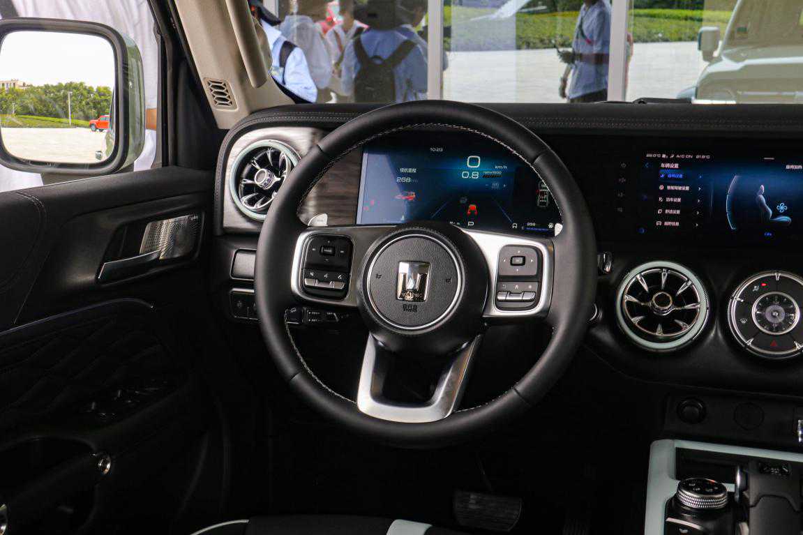 首先多功能方向盘配有换挡拨片,造型和手感都属于目前越野车中的上乘,丰富且整齐的按键布局也提供了足够的功能性。双12.3英寸的屏幕显示效果细腻清晰,内置功能也十分全面,像语音控制、CarPlay互联等,几乎包括了目前长城汽车全部最主流前沿的功能配置。