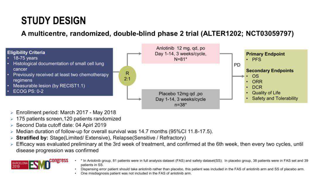 ALTER1202是一项评价安罗替尼对比安慰剂治疗复发性SCLC疗效和安全性的多中心随机双盲的II期临床试验。2017年3月至2018年5月,研究人员将来自中国11家中心的120名经二线化疗后出现病情进展(局限进展或广泛进展)的SCLC患者按照2:1的比例分为安罗替尼组和安慰剂组(用药方案:12mgPOQDd1-d4q3w)。