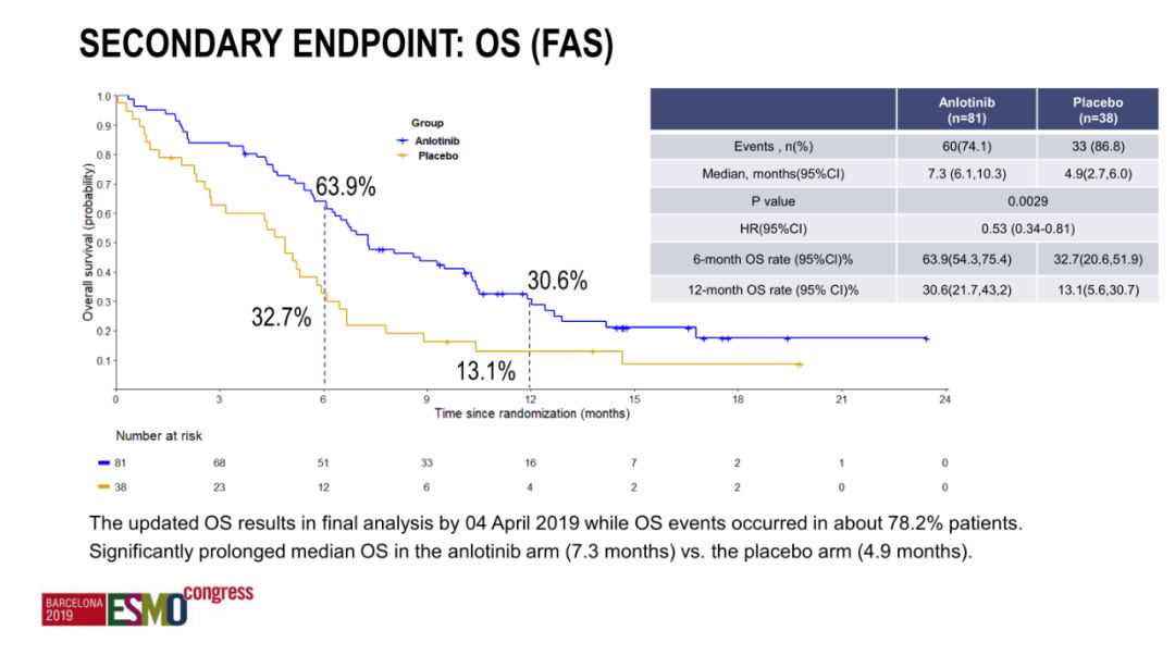 本次大会发布的最终分析结果表明,安罗替尼组中位OS较安慰剂组显著延长约2.4个月(7.3个月个月;,95%;P=0.0029)。研究中共有78.2%的患者获得OS获益,其中安罗替尼组组60例,安慰剂组有33例。安罗替尼组患者6个月、1年生存率分别为63.9%、30.6%,而安慰剂组则为32.7%和13.1%。