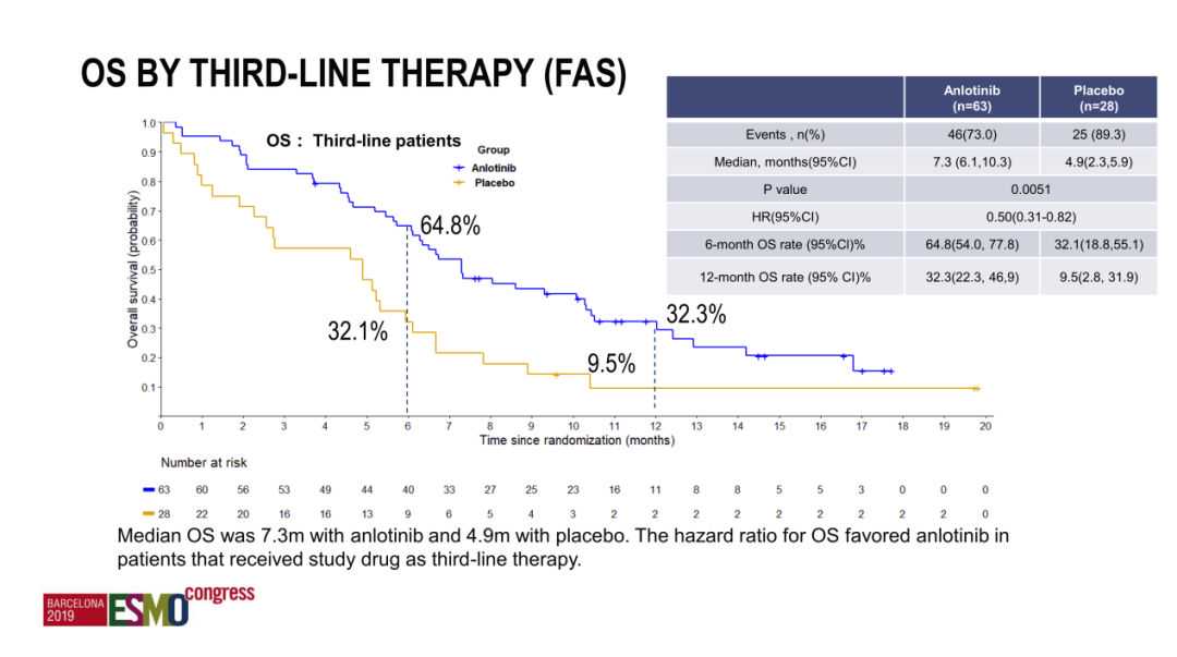 在接受安罗替尼作为三线治疗的患者亚组中,安罗替尼组与安慰剂组相比OS显著延长了2.4个月,死亡风险降低了50%(7.3个月个月;,95%;P=0.0051)。安罗替尼组患者6个月、1年生存率分别为64.8%、32.3%,而安慰剂组则为32.1%和9.5%。获得了与总体人群一致的结果。