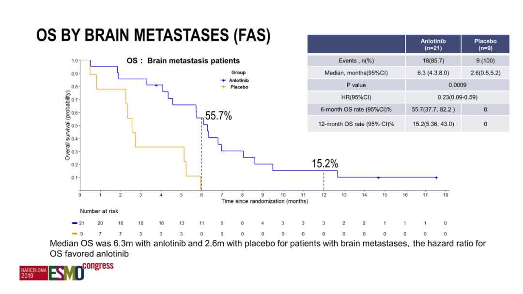脑转移一直是临床非常棘手的难题,尤其是SCLC患者脑转移更为常见且预后非常差。可喜的是在ALTER1202脑转移亚组分析中,安罗替尼可以明显延长脑转移患者的OS,OS延长了3.7个月,死亡风险降低了77%(6.3个月个月,,95%;P=0.0009)。安罗替尼组患者6个月、1年生存率分别为55.7%、15.2%,而安慰剂组没有患者的OS超过6个月。