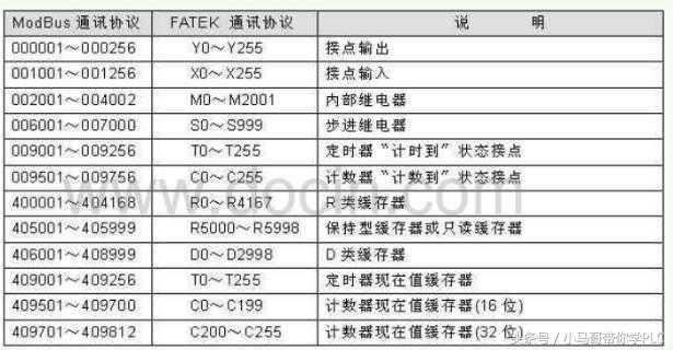 完成上面的操作其实永宏PLC的modbus从站功能就已经创建好了,永宏PLC已经集成Modbus协议集,支持Modbus协议通讯主、从机模式,并将其内部的寄存器和Modbus寄存器做了对应,这里我们使用的是其从站模式。可编程控制器内部元件编号与对应的Modbus地址编号如下表示: