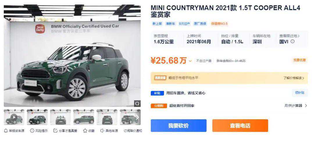 再来看看嫂子喜欢的MINICOUNTRYMAN,7月22日起2023款前驱版不再接受预定,受线束限产影响,四驱版配置调整,取消电动尾门和方向盘电加热功能,同时增加“灵感+”套装,四款车型价格区间为30.43-35.36万元,部分现车可享车辆购置税减半政策优惠。JCW性能版还取消了自适应悬架,售价调整为41.98万元。可以看到,MINICOUNTRYMAN2023款的新车价格已经超出了米哥的购车预算,25万左右建议考虑二手车。在二手车之家发布的车源列表中,这辆MINICOUNTRYMAN2021款1.5TCOOPERALL4鉴赏家,售价25.68万元,相比新车省了5.78万。该车是BMW官方认证二手车,通过严苛筛选,品质有保障。表显里程1.6万公里,妥妥的准新车,性价比非常高。