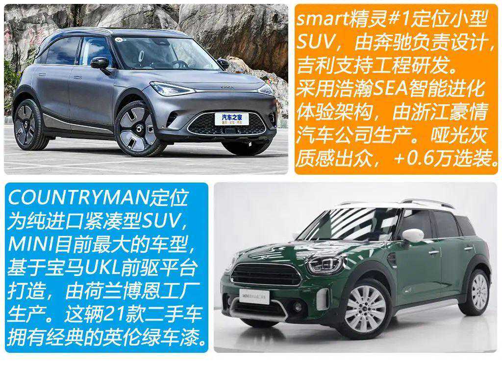 邻居米哥最近打算买车,他自己平时开一辆5系,这次想给媳妇儿添辆小一点的SUV。米哥的购车预算在25万元左右,他觉得新出的电动车smart精灵1和MINICOUNTRYMAN哪个更值得买,米哥想听听我的想法。