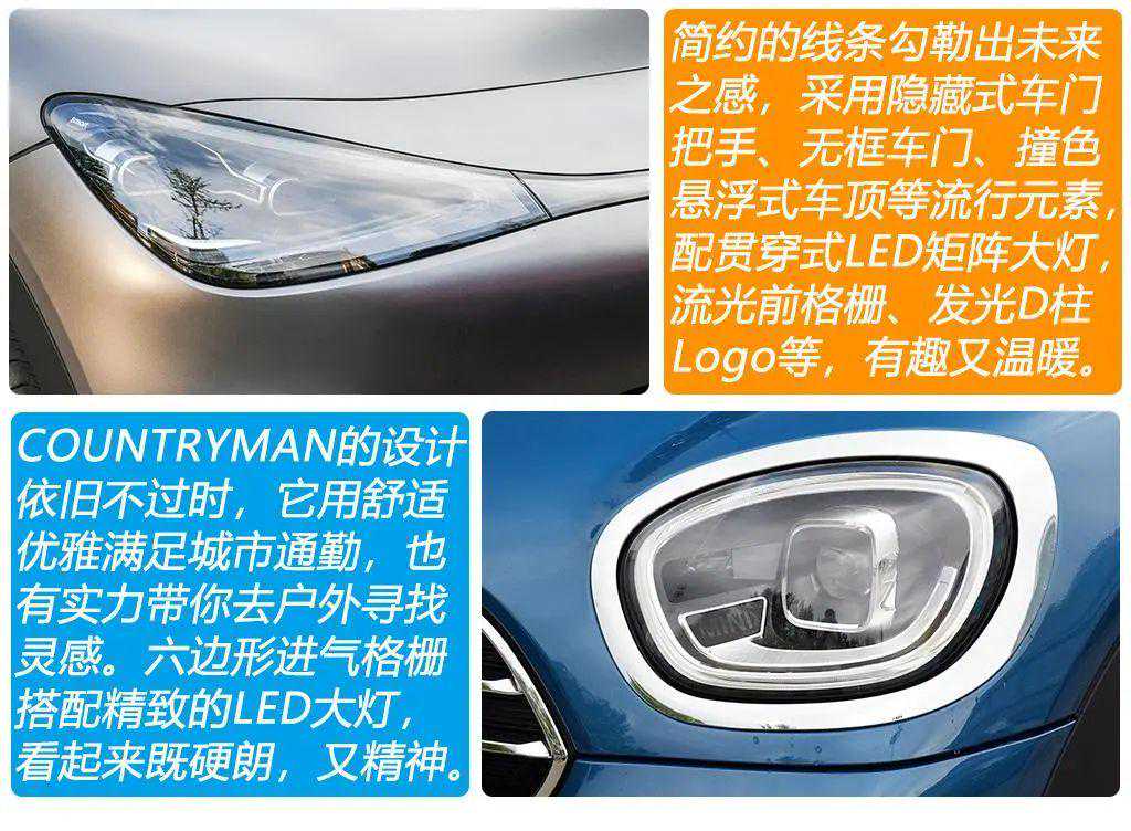在汽车产业电动化、智能化的趋势下,2019年,smart品牌全球合资公司成立,由梅赛德斯-奔驰和吉利汽车集团持股。全新一代smart纯电汽车精灵1以简约线条呈现外观风格,采用隐藏式门把手、无框车门、悬浮式车顶等时下流行的设计元素,在体现未来感的同时,配备贯穿式LED矩阵大灯、贯穿式LED尾灯、流光主动进气格栅、D柱发光Logo等诸多有趣又温暖的光影元素。车漆只有粒子白、沉寂黑、赛博银3种颜色是免费的,其它颜色需加0.3-0.6万元。MINICOUNTRYMAN给人的整体感觉更传统也更硬朗,前脸六边形进气格栅搭配精致的LED大灯,显得很精神,ALL4外观套件和米字旗尾灯则独特有型。车漆是经典的英伦绿,车顶和外后视镜盖选择了白色,很耐看的组合。