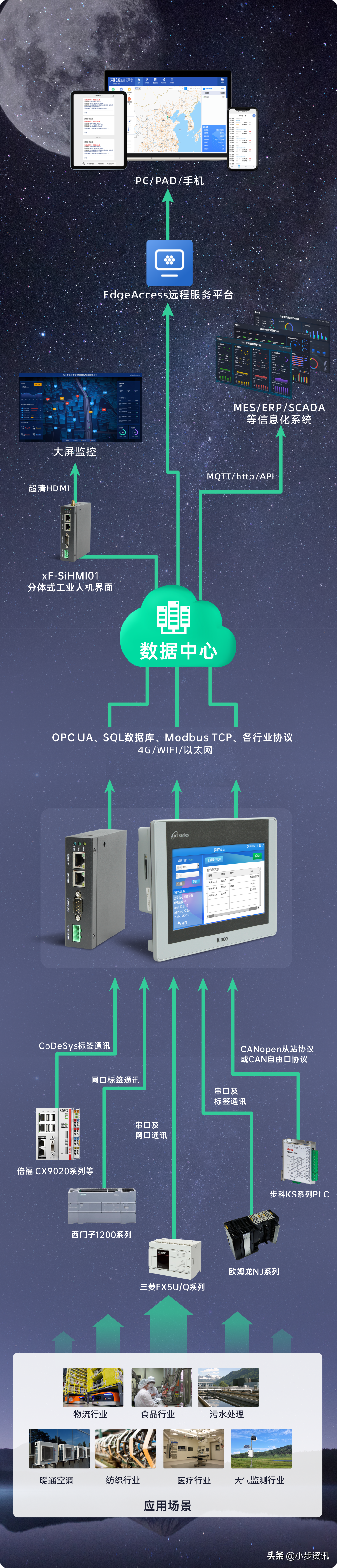 当下,已有国内少数比较领先的国产物联网型HMI及物联网关兼备向下连接各类PLC、传感器,向上连接物联网的强大能力。