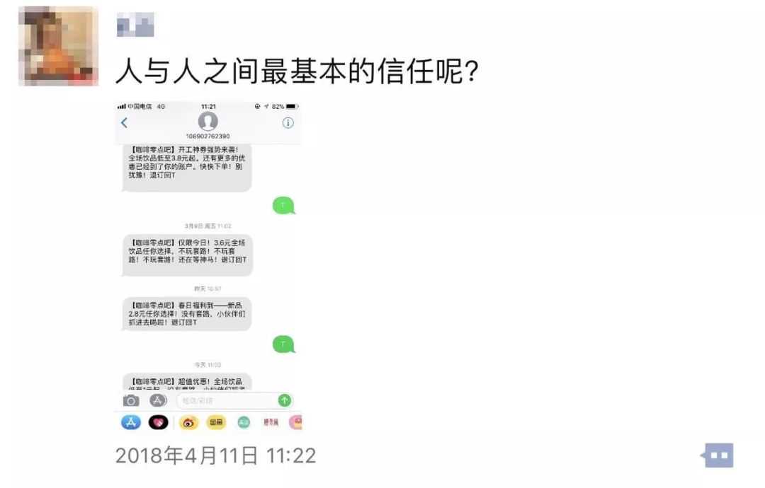 今年1月底,成都市民阿琳在办公楼楼下的“咖啡零点吧”自助机上购买了一杯饮品,此后手机便不断收到来自“咖啡零点吧”发来的推销短信。