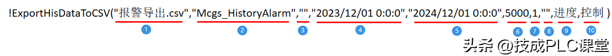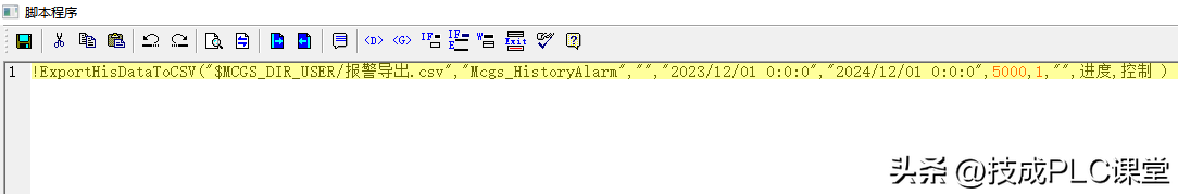 !ExportHisDataToCSV("$MCGS_DIR_USER/报警导出.csv","Mcgs_HistoryAlarm","","2023/12/010:0:0","2024/12/010:0:0",5000,1,"",进度,控制)