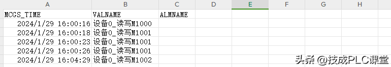 举一个例子,如果参数3不为空,写入”MCGS_TIME,VALNAME,ALMNAME”,则代表只导出这三个报警记录,打开打开报警导出.csv文件可看到;