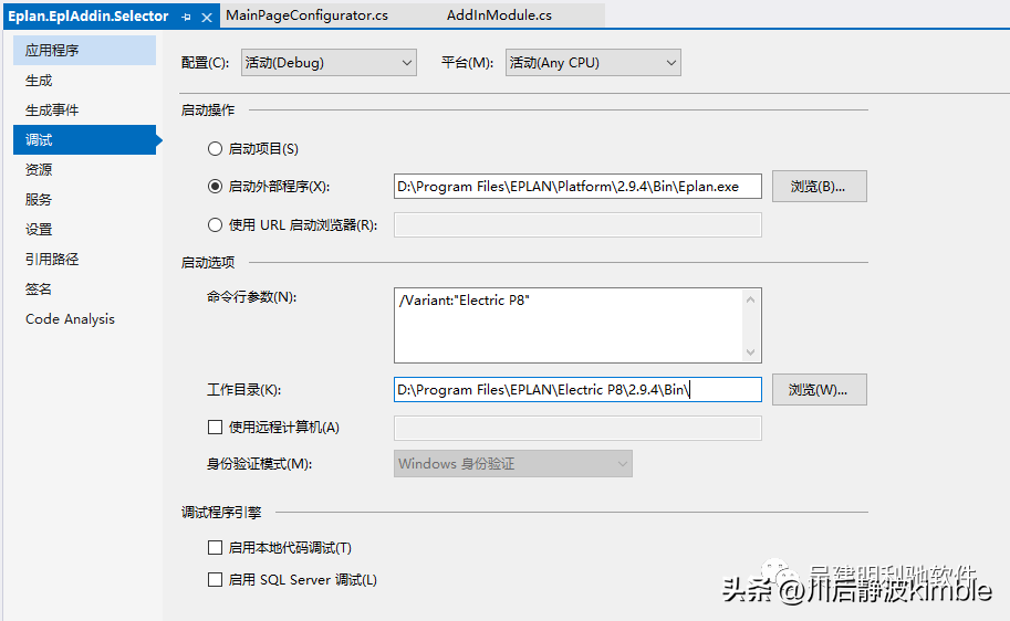 三、调试环境为了实现在EPLAN中断调试,就需要将VS中附加到EPLAN进程中,在VS中右键项目属性,在调试项做如下设置: