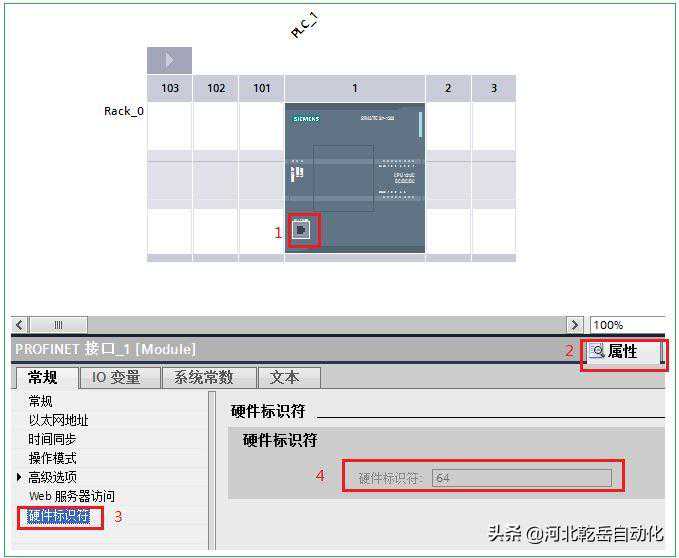 硬件标识符是在“设备组态”中,双击PROFINET接口,然后在“属性”中的“硬件标识符”中查看。