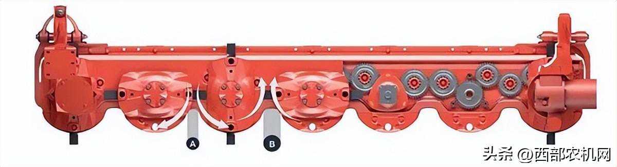 前悬挂所需拖拉机输入为1000转。前部齿轮箱采用上下分体设计,单边转弯半径可达90度。设备所需动力为140-160马力。