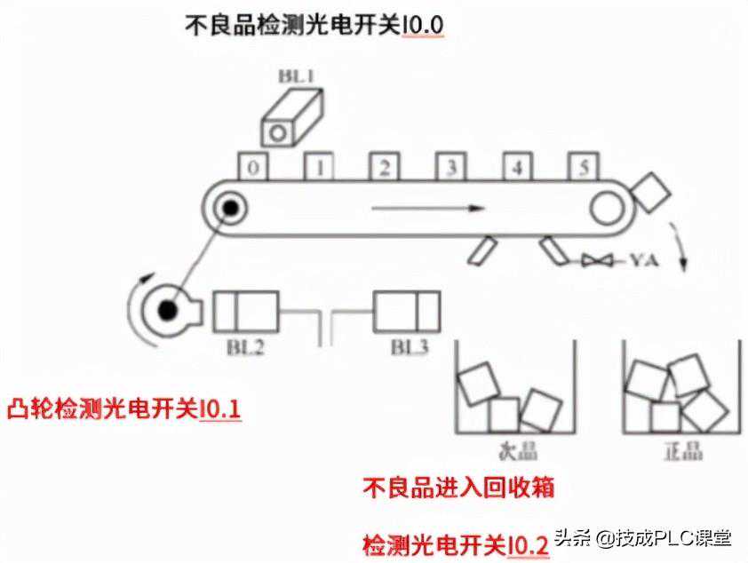 如图1所示:在传送带上有“0”“1”“2”“3”“4”“5”总共6个工位。机械手把产品放在第“0”个工位上,通过光电开关(或者视觉)检测。当机械手每放入一个产品,传送带移动一个工位。当传送带每移动一个工位凸轮转一圈(检测到一个信号)。当检测到不良品时,到达第“4”个工位气缸推出。当不良品(次品)掉入箱体里,将检测到一个信号从而气缸可以缩回。